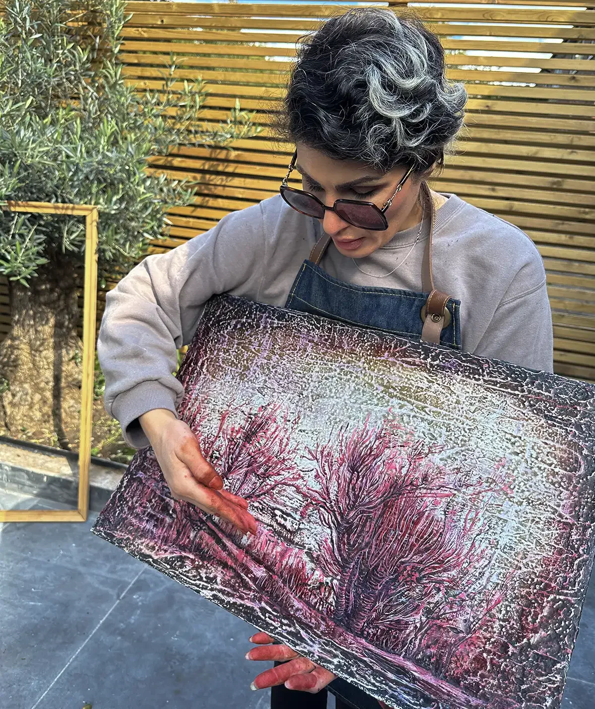 Still Point is a singular mixed media tree painting by contemporary Cheshire artist Ladan Nouhani. This work invites the viewer into a quiet forest clearing — a “Bisheh” (بیشه) — that becomes a profound sanctuary in solitude. It represents a decisive moment in life: a place of stillness, peace, and refuge that we carry in memory, returning to it in times of sadness or desperation.