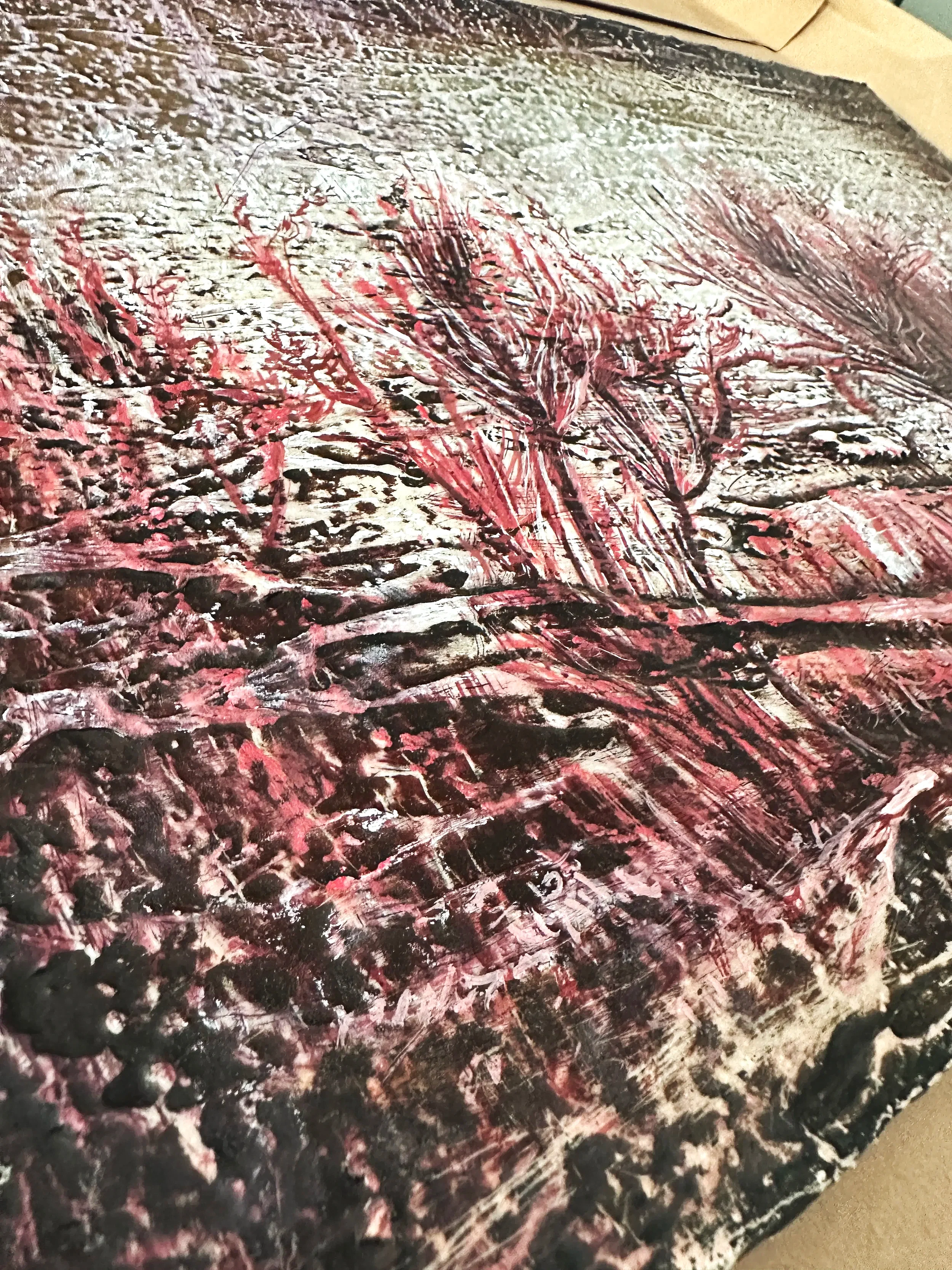 Once this underlying story was established, I layered in rich oil paints, building depth, atmosphere, and luminosity. Finally, I defined the forms of the trees with meticulous fountain pen and ink detailing. The ink, transparent yet precise, allows the earlier layers to remain visible, creating a delicate interplay between past and present — between what is revealed and what remains hidden.